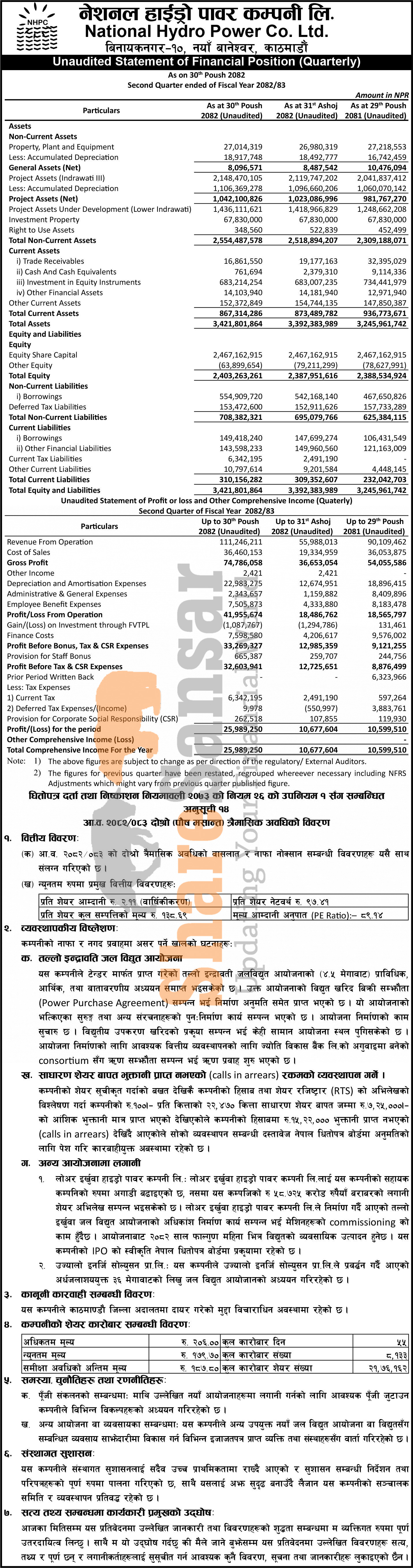 National Hydro Power Company Limited has posted a net profit of Rs 25.98 million and published its 2nd quarter company analysis of the fiscal year 2082/83.