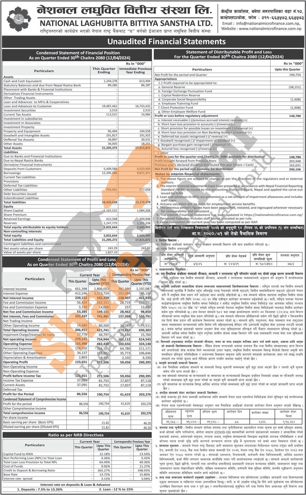 National Laghubitta Bittiya Sanstha Limited has posted a net profit of Rs 190.75 million and published its 3rd quarter company analysis of the fiscal year 2080/81.