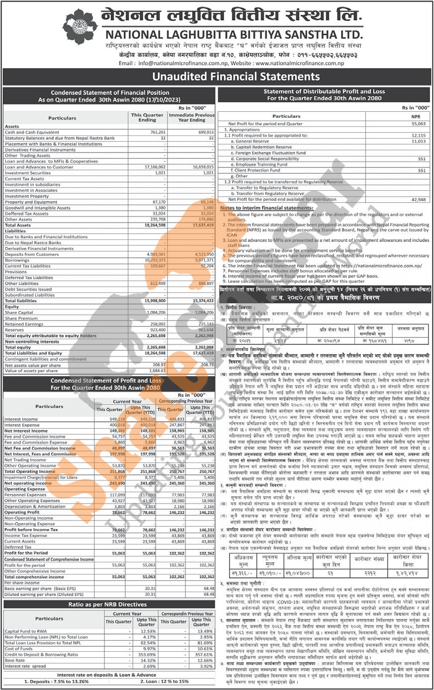 National Laghubitta Bittiya Sanstha Limited has posted a net profit of Rs 55.06 million and published its 1st quarter company analysis of the fiscal year 2080/81.
