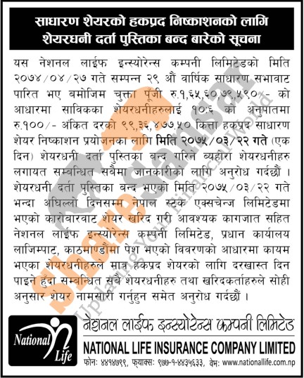 National Life Insurance Company Limited has announced a book closure date for its upcoming 10:6 ratio right share on 22nd Ashad, 2075.