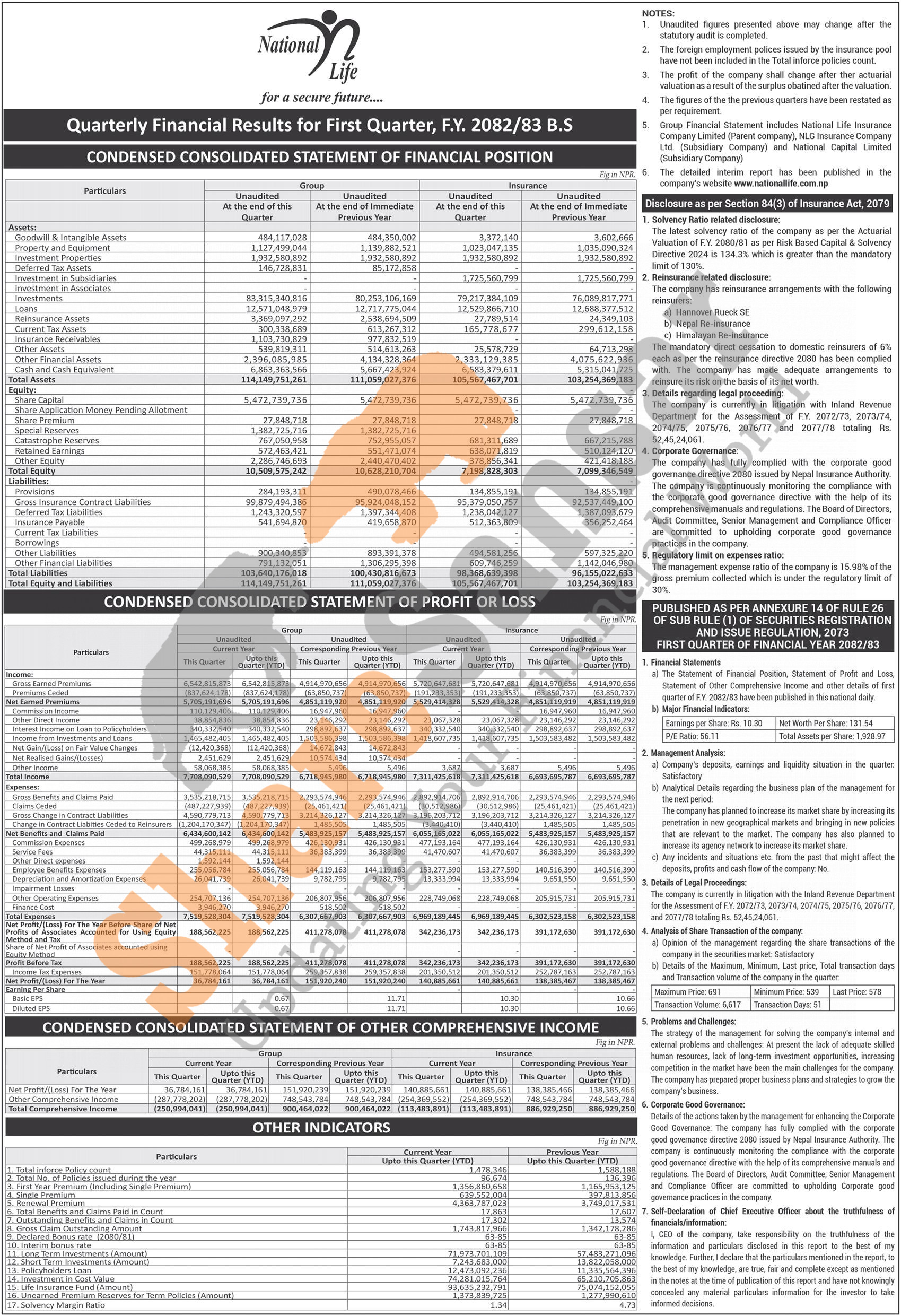 National Life Insurance Company Limited has posted a net profit of Rs 140.88 million and published its 1st quarter company analysis of the fiscal year 2082/83.