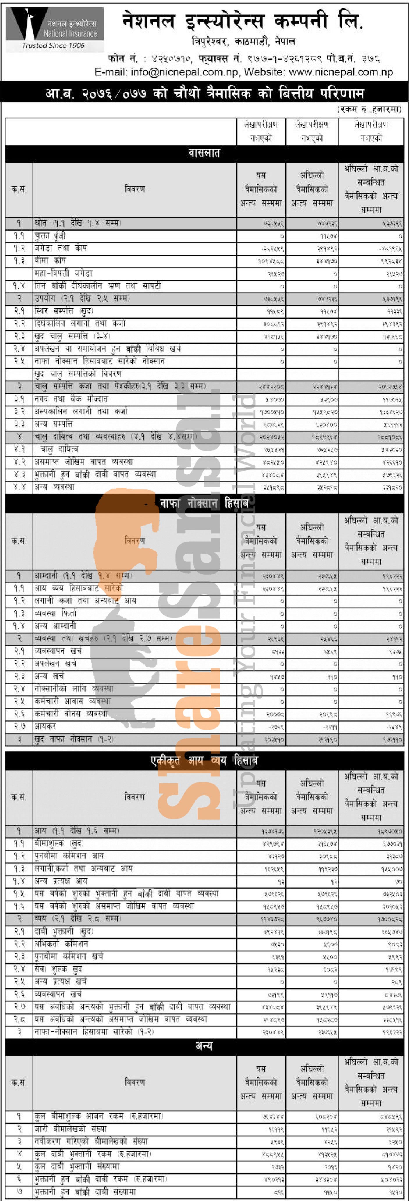 National Insurance Company Limited has posted a net profit of Rs 203.51 million during the 4th quarter of the fiscal year 2076/77.