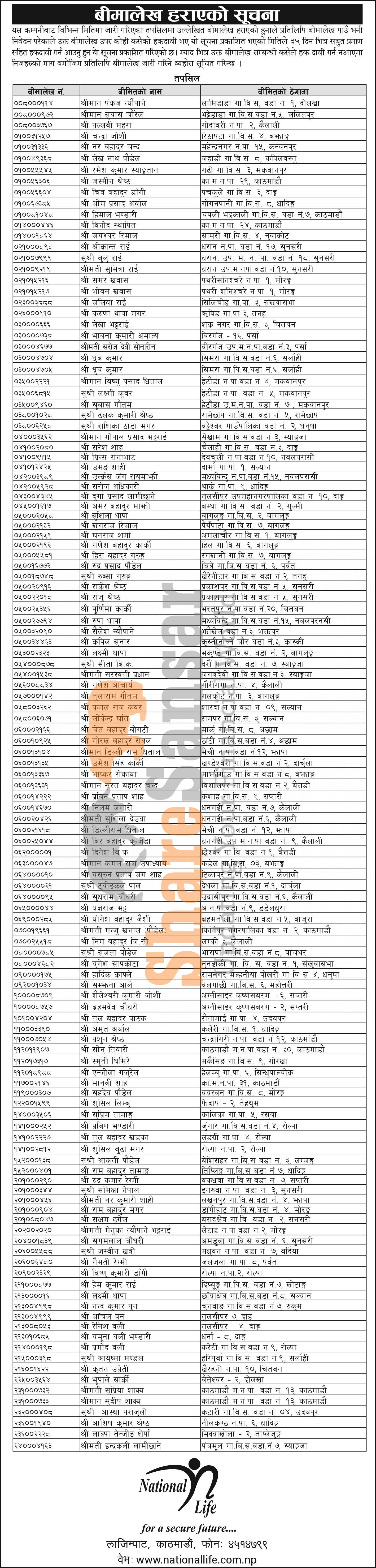 National Life Insurance Company Limited has published a notice regarding a claim for lost share certificates.