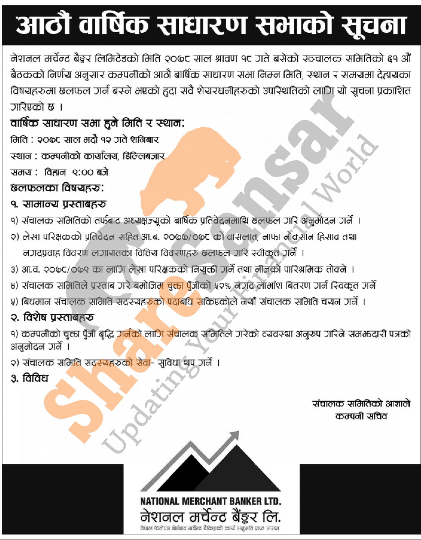 National Merchant Banker Limited has announced its 8th AGM going to be held on 12th Bhadra, 2078.
