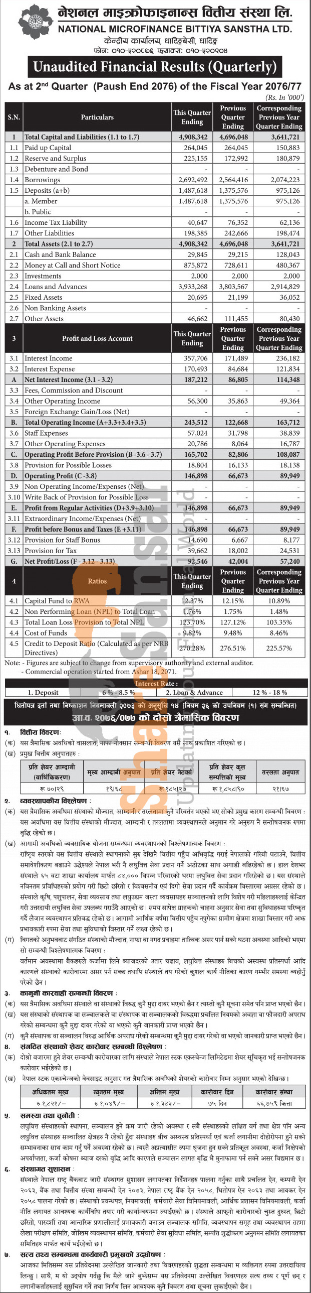 National Microfinance Bittya Sanstha Limited has posted a net profit of Rs 92.54 million and published its 2nd quarter company analysis of the fiscal year 2076/77.