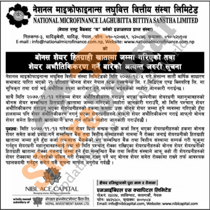 National Microfinance Laghubitta Bittiya Sanstha Limited has distributed 21% bonus shares directly to DEMAT accounts of its shareholders and has urged to dematerialize their shares.