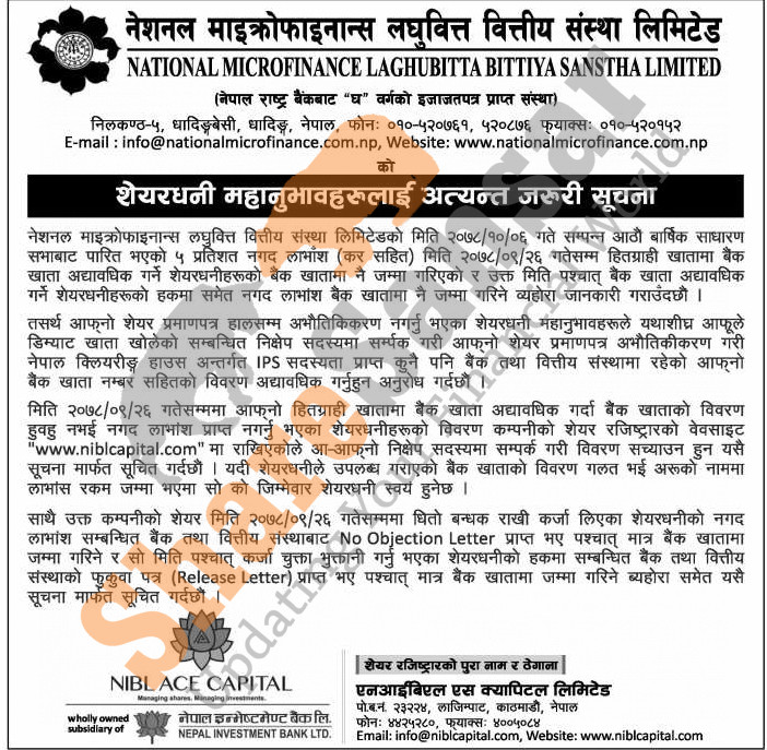 National Microfinance Laghubitta Bittiya Sanstha Limited has distributed 5% cash dividend directly to bank accounts and urged its shareholders to dematerialize their shares.