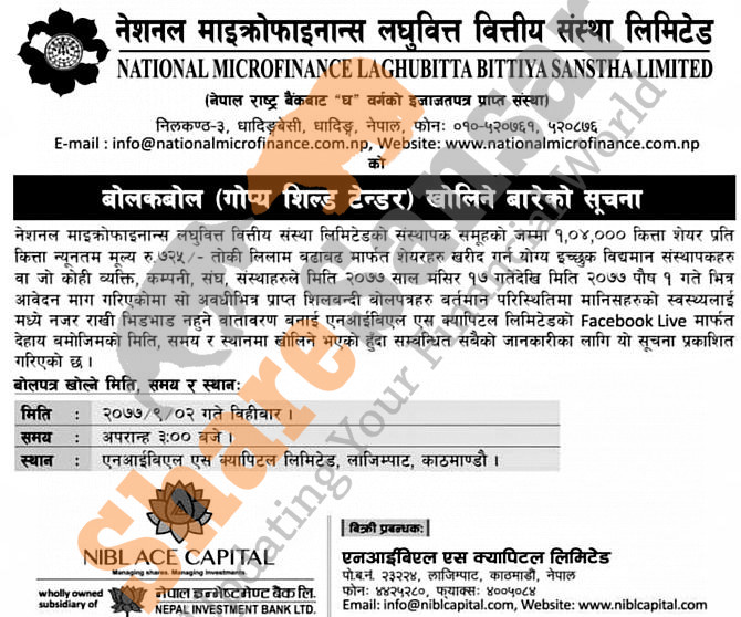 National Microfinance Laghubitta Bittiya Sanstha Limited has published a notice regarding bid opening date of 1,04,000 units promoter share in the auction to the general public on (2nd Poush, 2077).