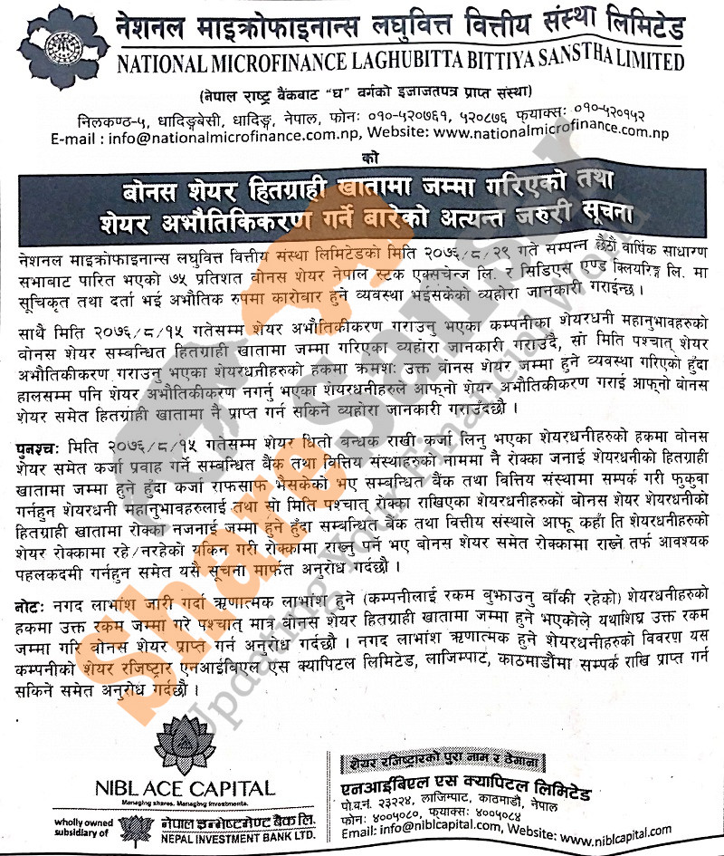 National Microfinance Laghubitta Bittiya Sanstha Limited is distributing 75% bonus shares directly to DEMAT accounts of its shareholders and has urged to dematerialize their shares.