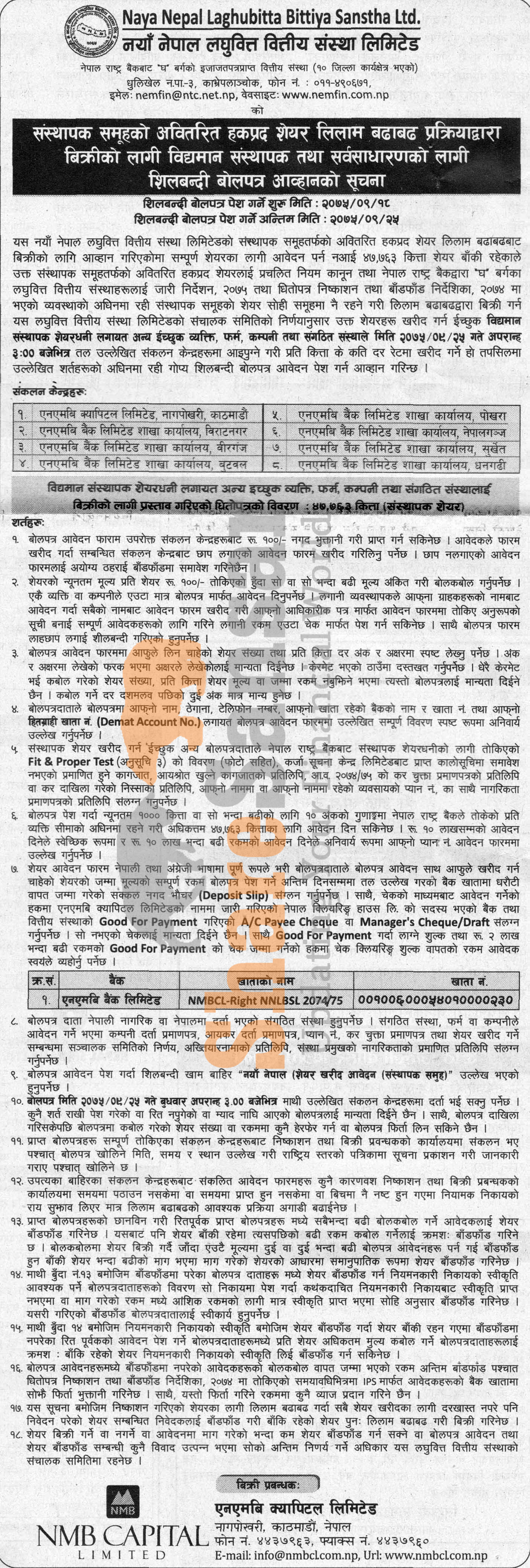 Naya Nepal Laghubitta Bittiya Sanstha Limited is selling its 47,763 unit promoter shares in auction to the general public from (18th to 25th Poush, 2075).