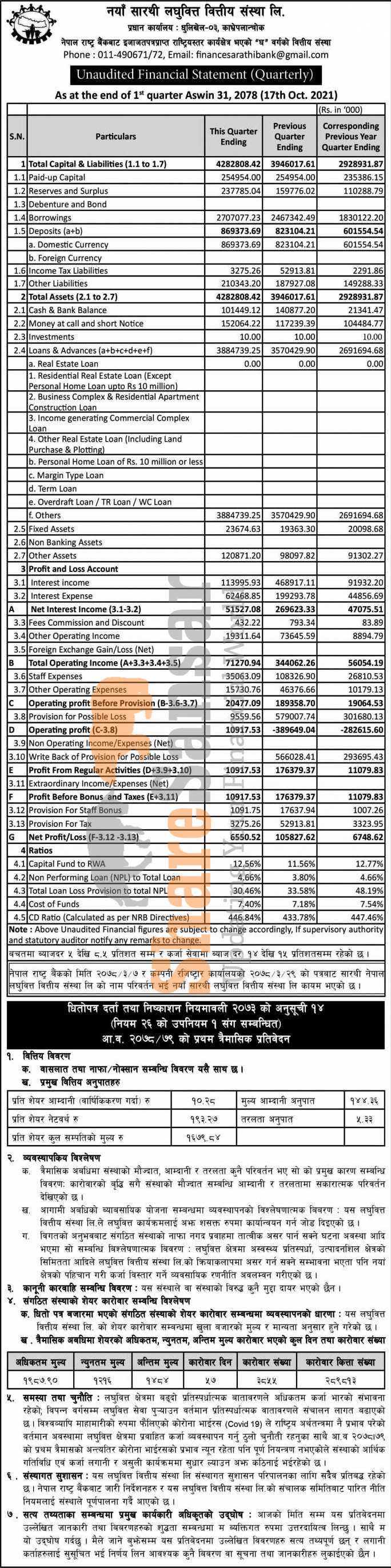 Naya Sarathi Laghubitta Bittiya Sanstha Limited has posted a net profit of Rs 6.55 million and published its 1st quarter company analysis of the fiscal year 2078/79.