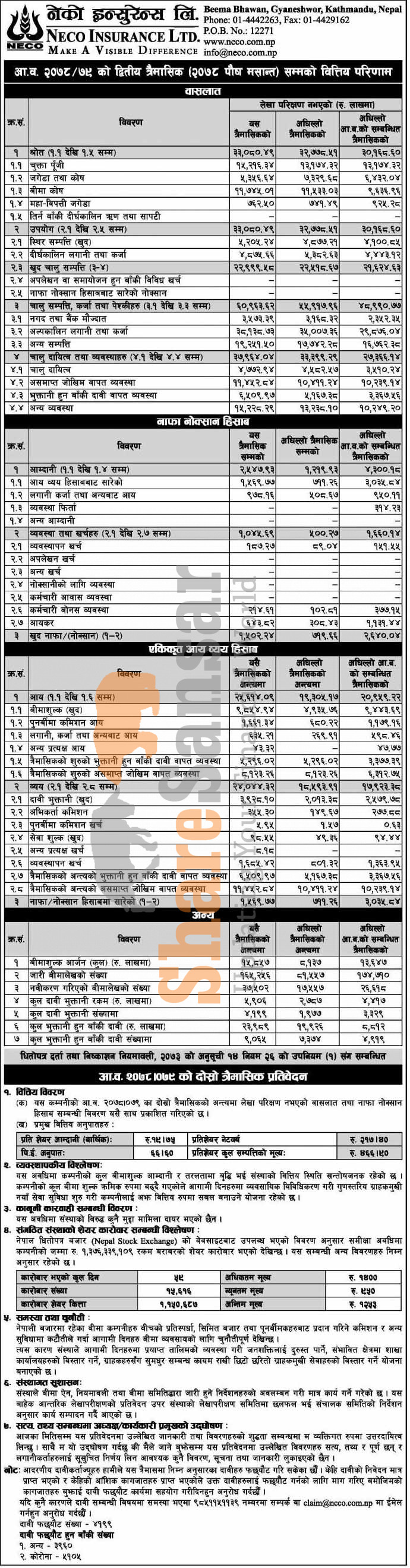 Neco Insurance Company Limited has posted a net profit of Rs 150.22 million and published its 2nd quarter company analysis of the fiscal year 2078/79.