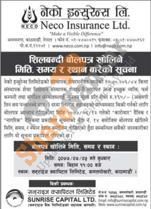 Neco Insurance Company Limited has published a notice regarding bid opening date of 10,70,206.84 units promoter share in the auction to the general public on (5th Kartik, 2077).