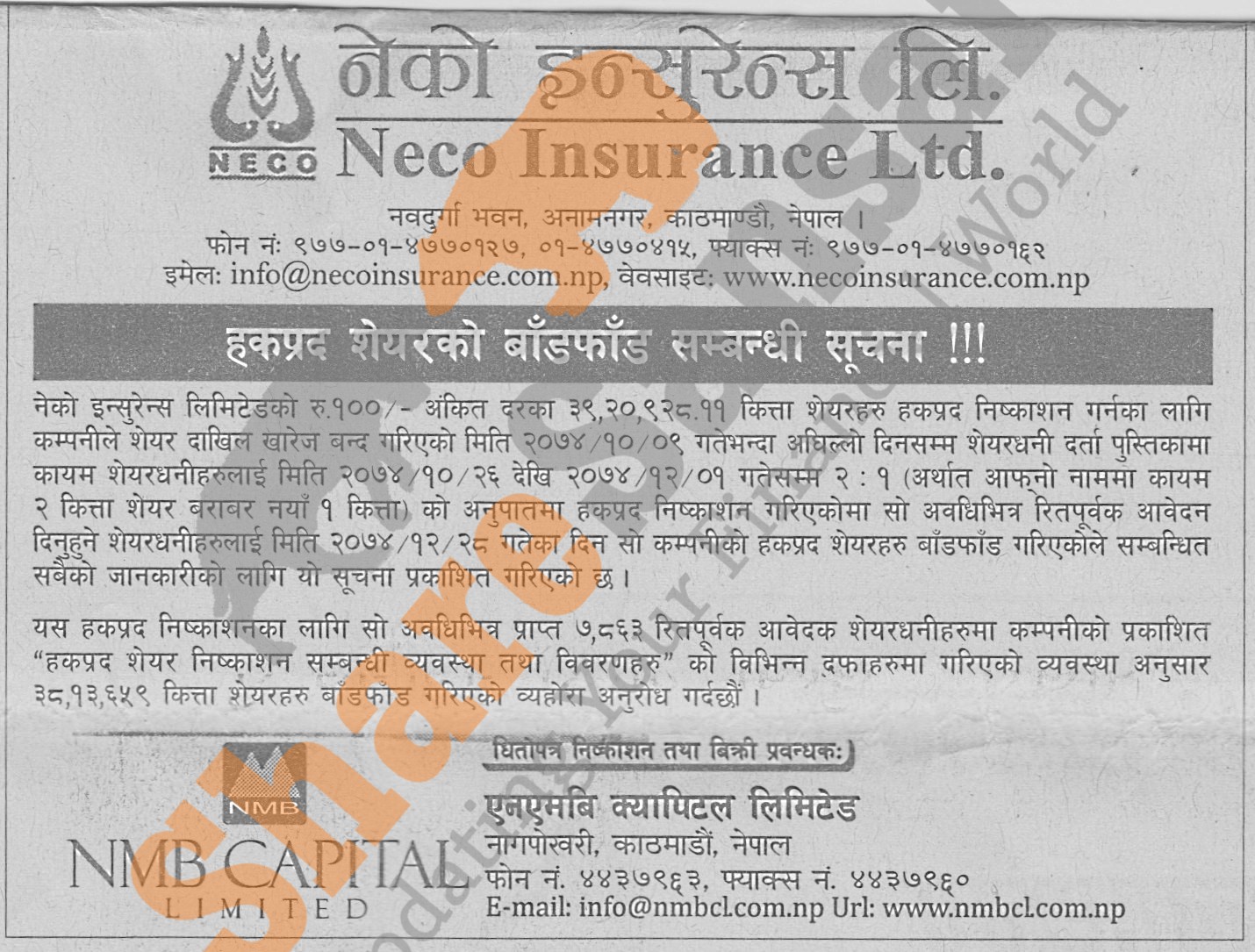Neco Insurance Limited has allotted its 2:1 ratio right shares to its shareholders on 28th Chaitra, 2074.