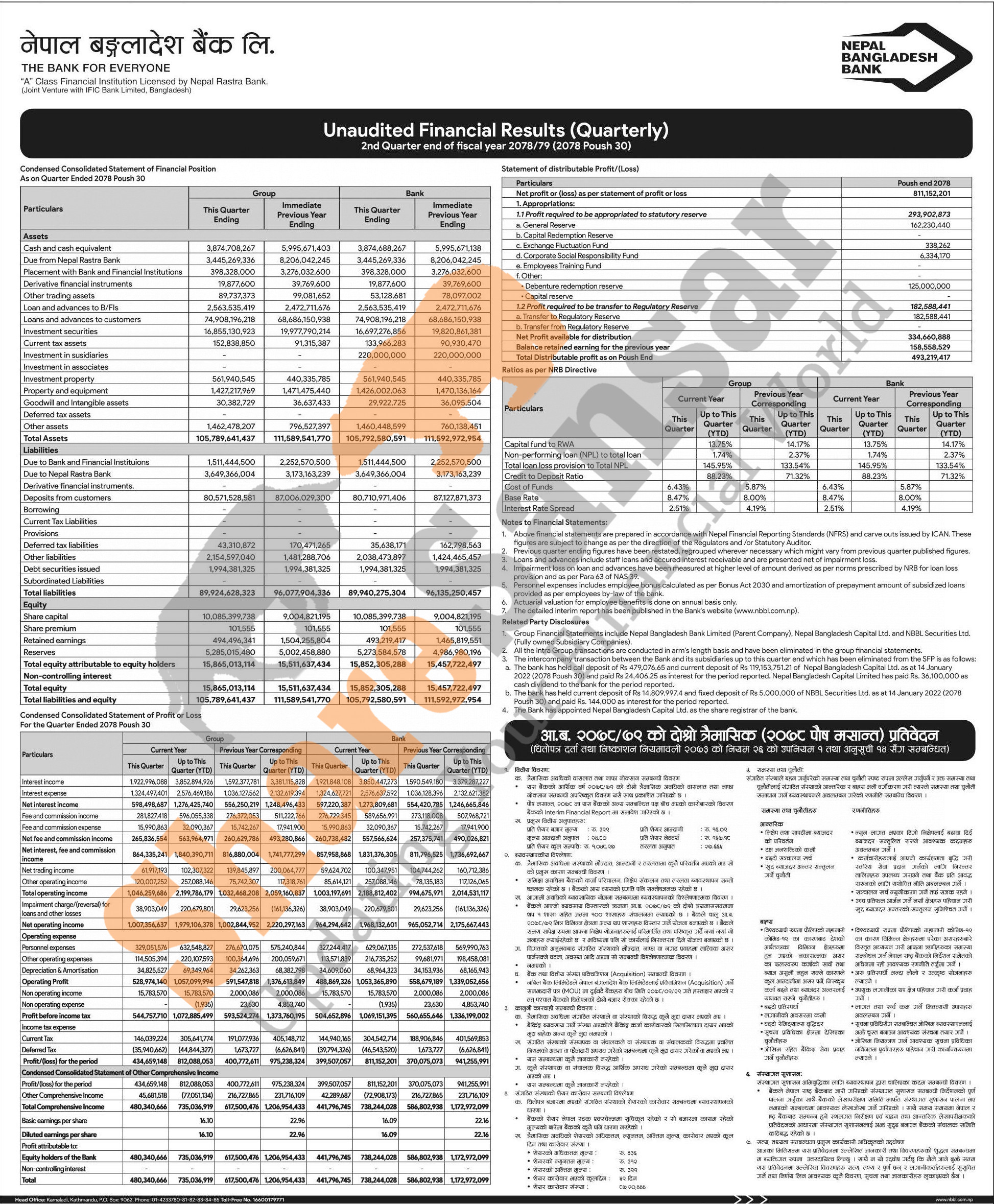 Nepal Bangladesh Bank Limited has posted a net profit of Rs 811.15 million and published its 2nd quarter company analysis of the fiscal year 2078/79.