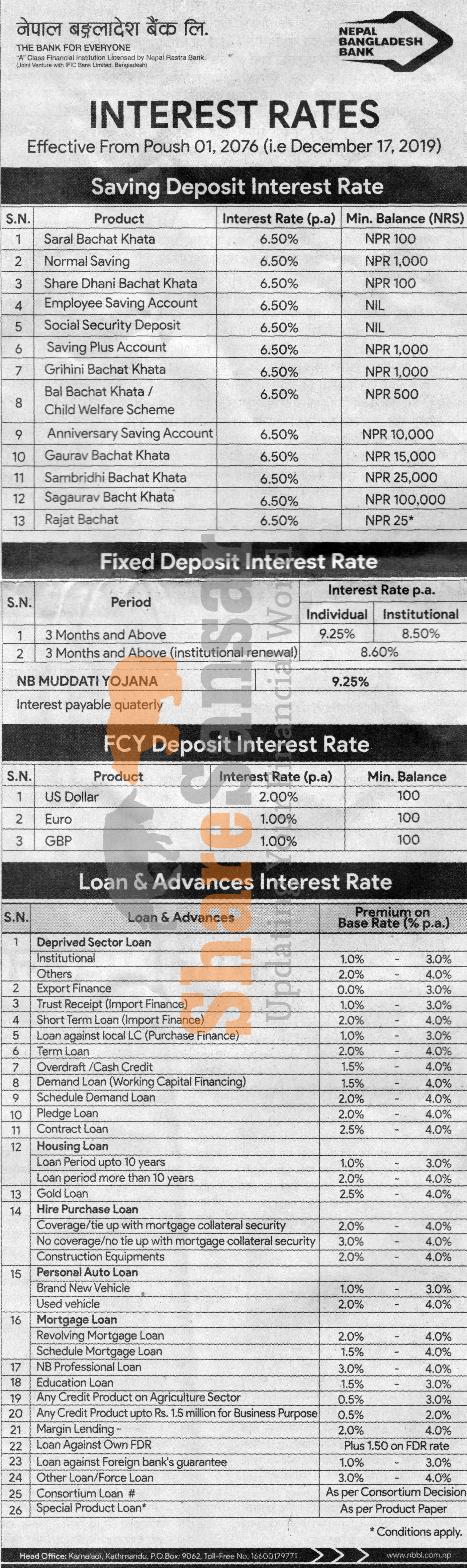 Nepal Bangladesh Bank Limited has published a notice regarding new interest rate and its effective from 1st Poush, 2076.