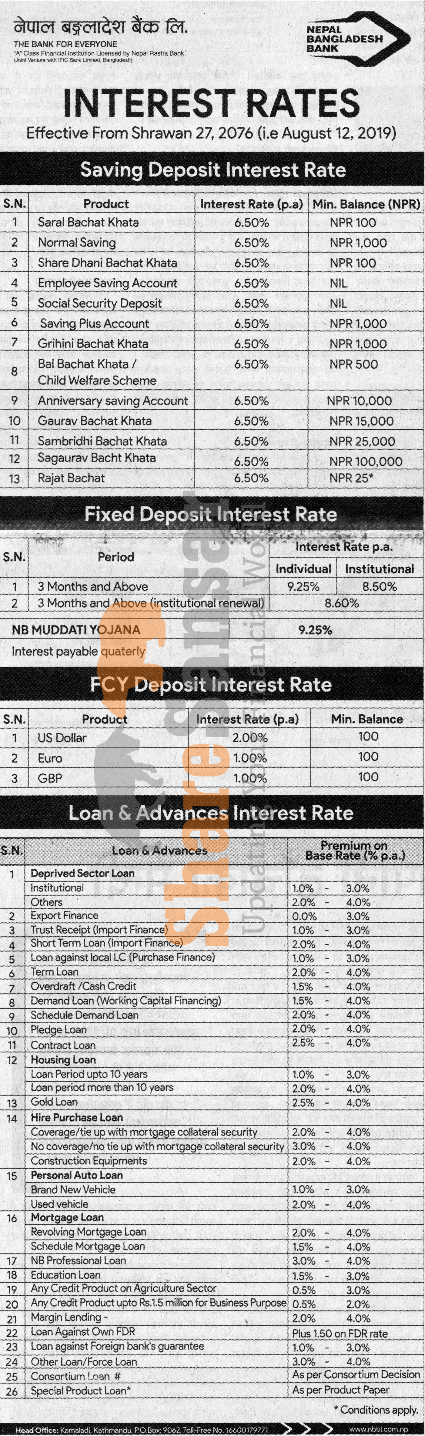 Nepal Bangladesh Bank Limited has published a notice regarding new interest rate and its effective from 27th Shrawan, 2076.