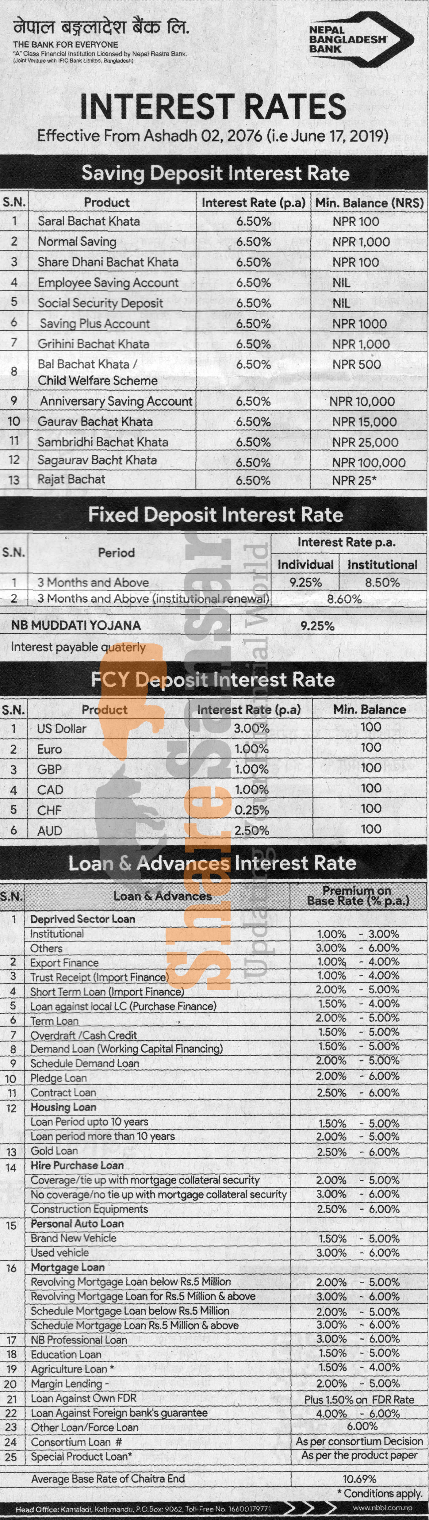 Nepal Bangladesh Bank Limited has published a notice regarding new interest rate and its effective from 2nd Ashad, 2076.
