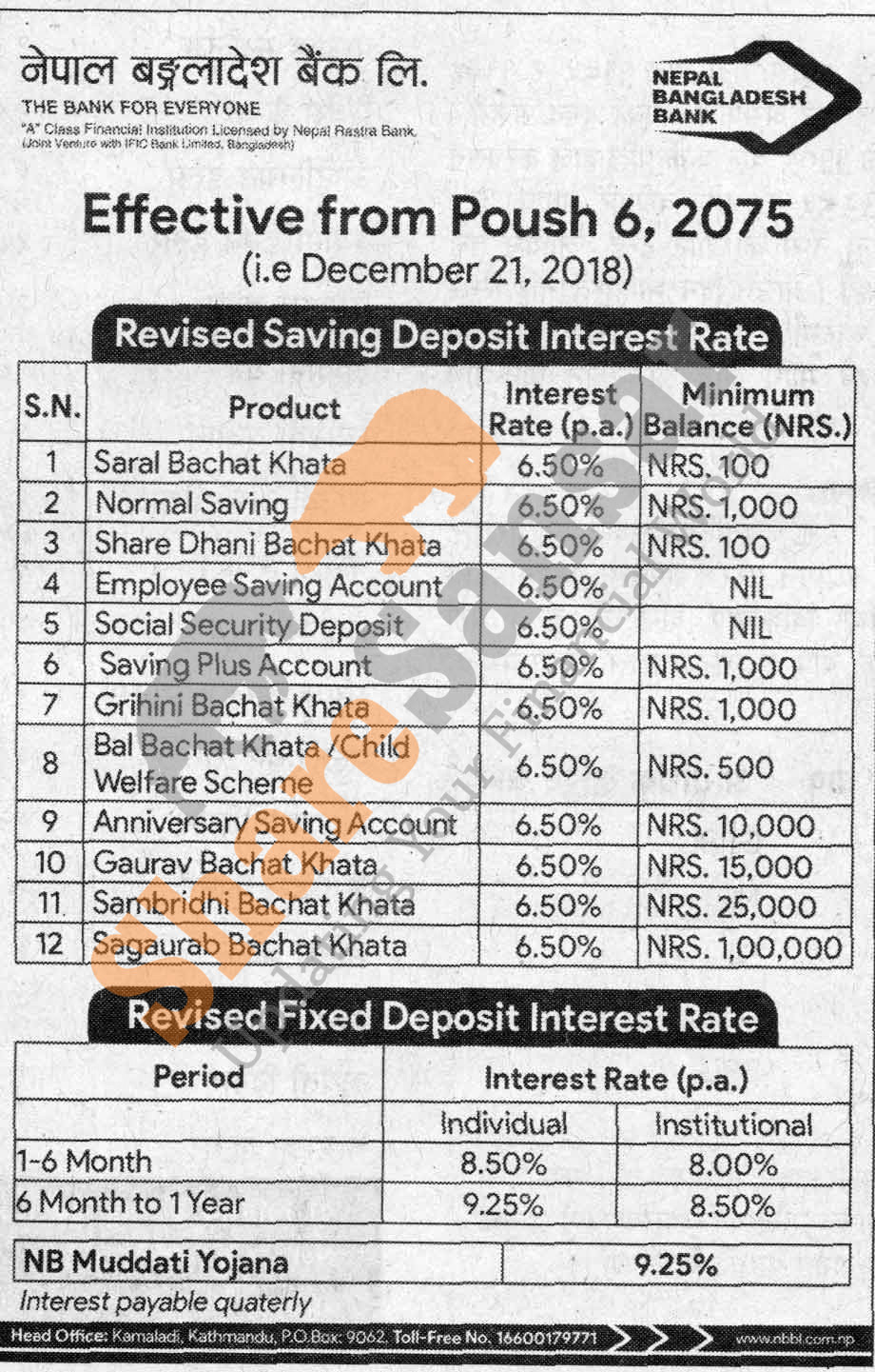 Nepal Bangladesh Bank Limited has published a notice regarding new interest rate and its effective from 6th Poush, 2075.