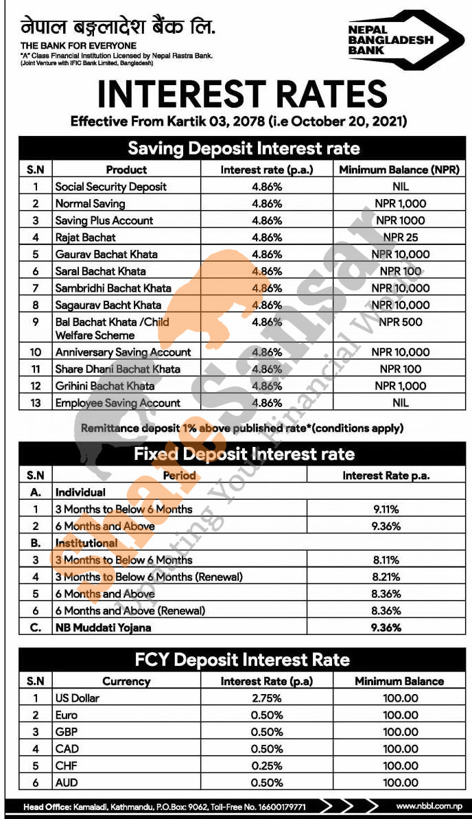Nepal Bangladesh Bank Limited has published a notice regarding new revised interest rate and it's effective from 3rd Kartik, 2078.
