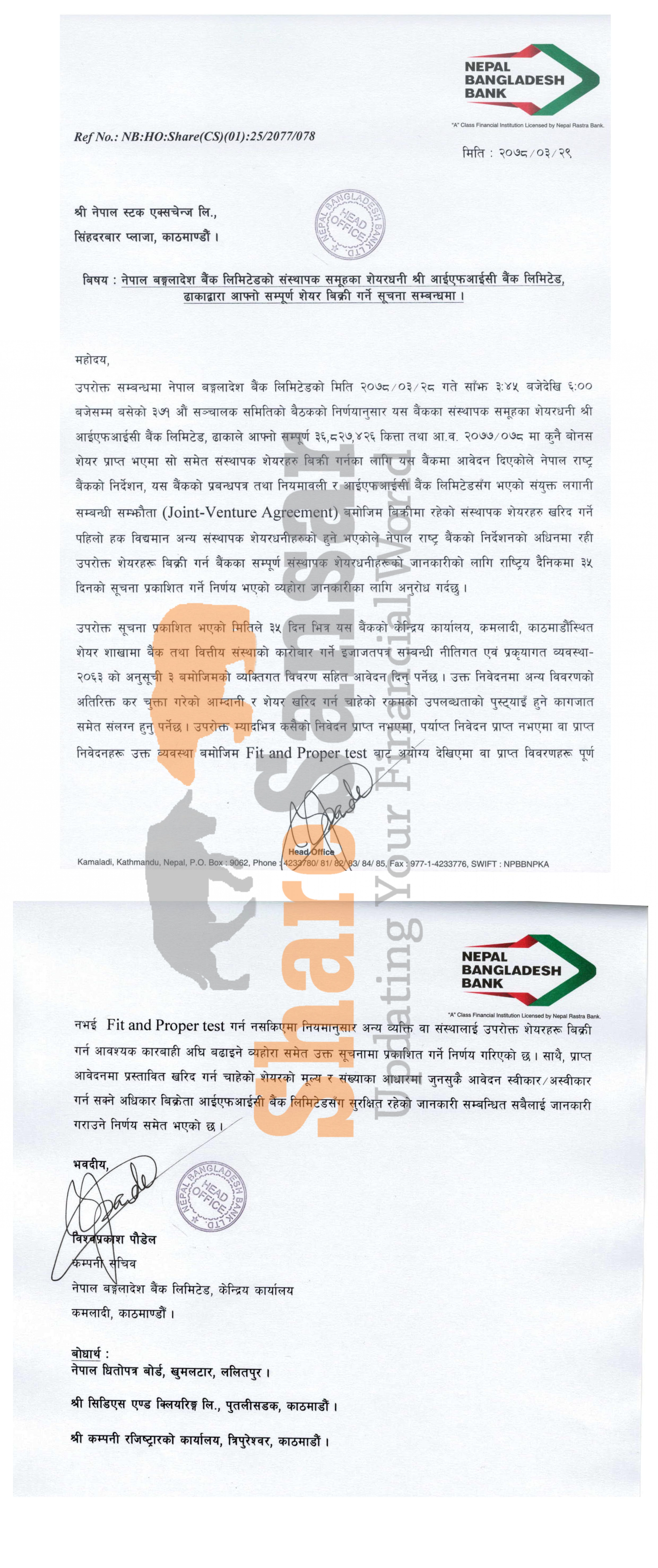 Nepal Bangladesh Bank Limited has published a notice regarding sales of its Promoter shares by IFIC Bank Ltd, Dhaka.