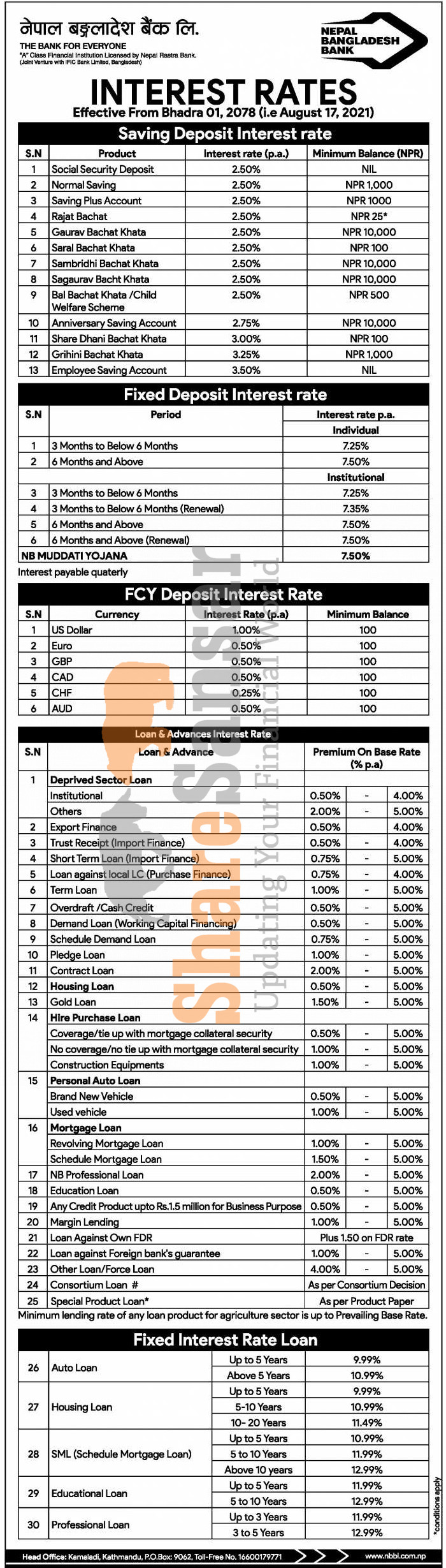 Nepal Bangladesh Bank Limited has published a notice regarding the new interest rate for deposit and loan products and it's effective from 1st Bhadra, 2078.