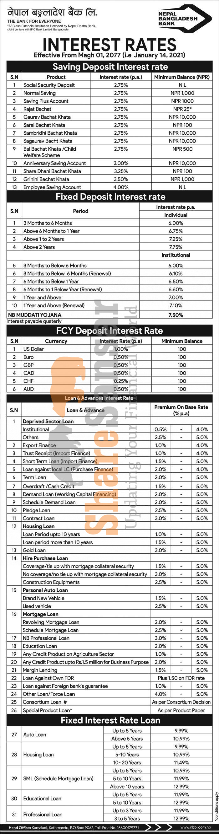 Nepal Bangladesh Bank Limited has published a notice regarding the new interest rate for deposit and loan products and it's effective from 1st Magh, 2077.