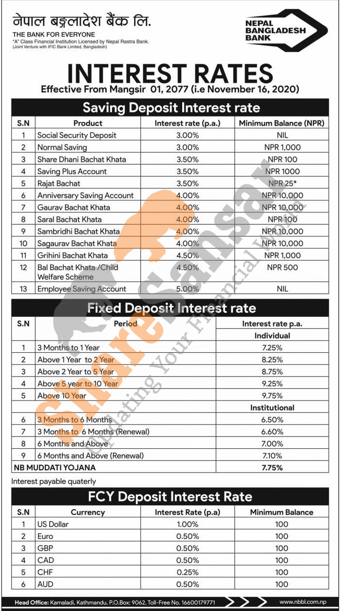 Nepal Bangladesh Bank Limited has published a notice regarding the new interest rate for its deposit products and it's effective from 1st Mangsir, 2077.