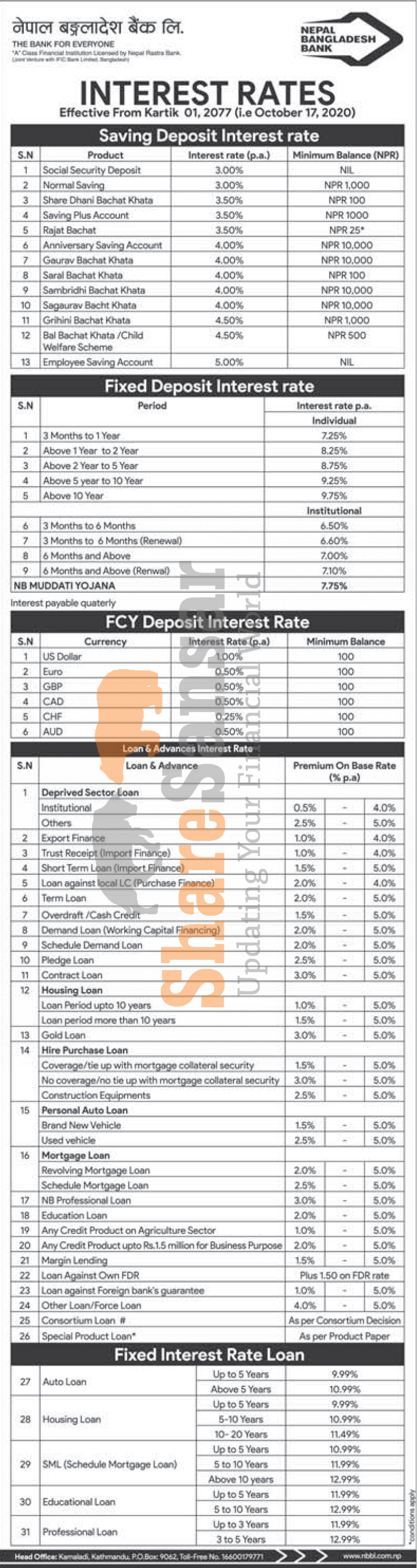 Nepal Bangladesh Bank Limited has published a notice regarding the new interest rate for its loan and deposit products and it's effective from 1st Kartik, 2077.