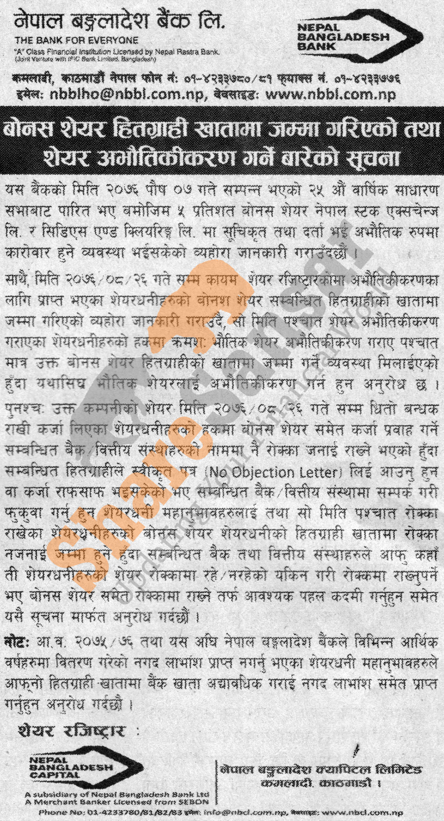 Nepal Bangladesh Bank Limited is distributing 5% bonus share directly to DEMAT accounts and urged its shareholders to dematerialize their shares.