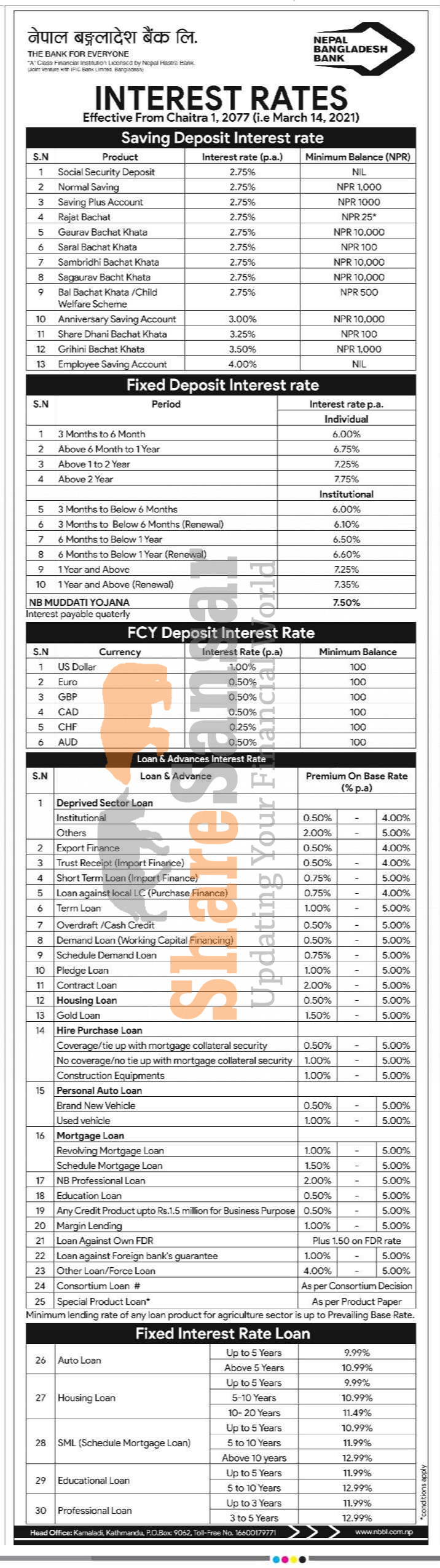 Nepal Bangladesh Bank Nepal Limited has published a notice regarding the new interest rate for deposit and loan products and it's effective from 1st Chaitra, 2077.