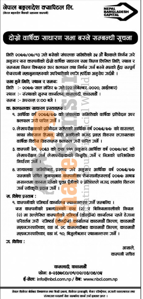 Nepal Bangladesh Capital Limited has announced its 2nd AGM going to be held on 7th Mangsir, 2077.