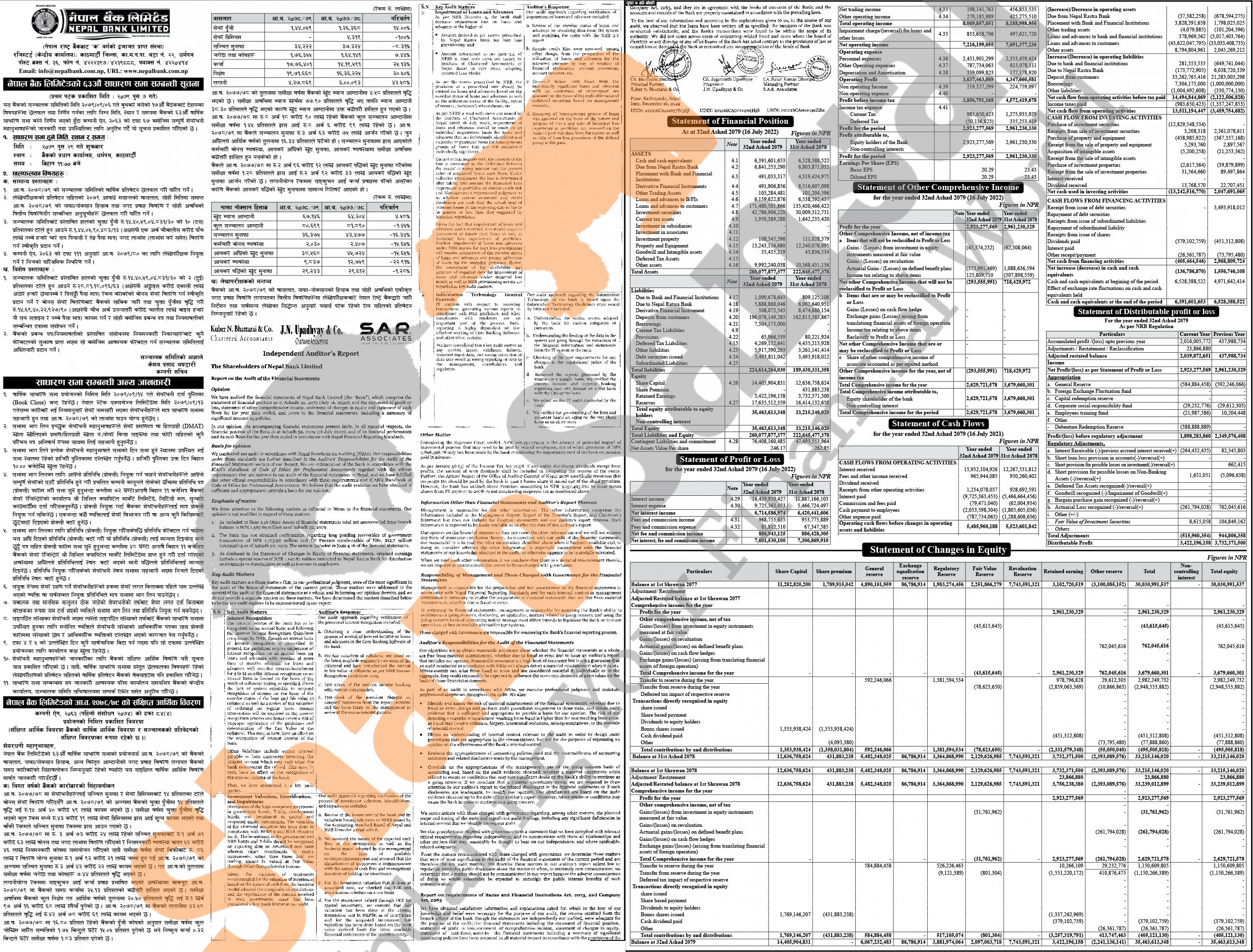 Nepal Bank Limited has announced its 63rd AGM going to be held on 29th Poush, 2079 and has published its annual financial highlights of the fiscal year 2078/79.