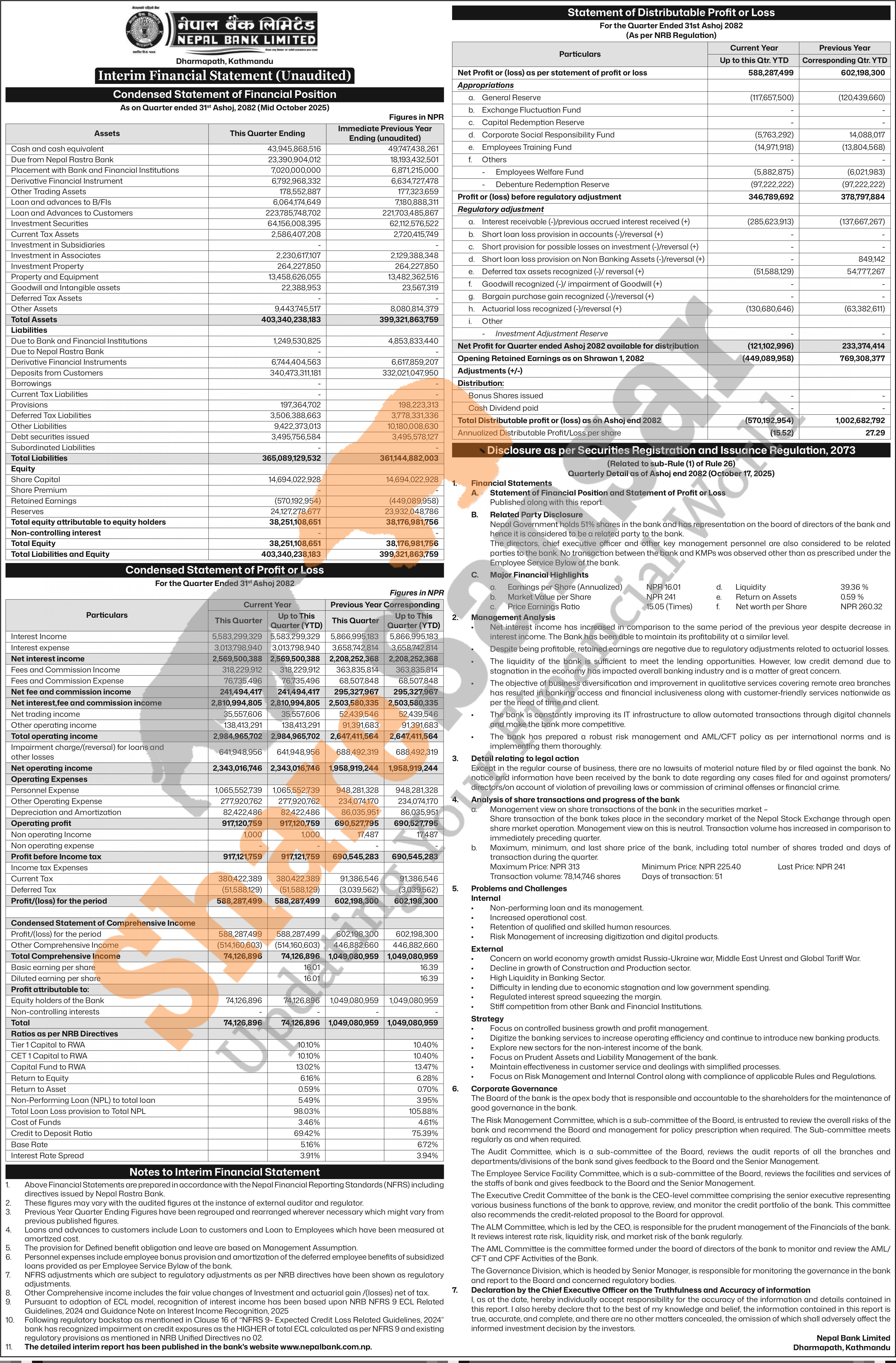 Nepal Bank Limited has posted a net profit of Rs 588.28 million and published its 1st quarter company analysis of the fiscal year 2082/83.