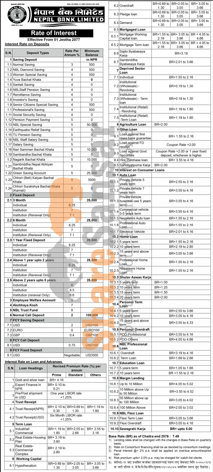 Nepal Bank Limited has published a notice regarding new interest rate and its effective from 1st Jestha, 2077.
