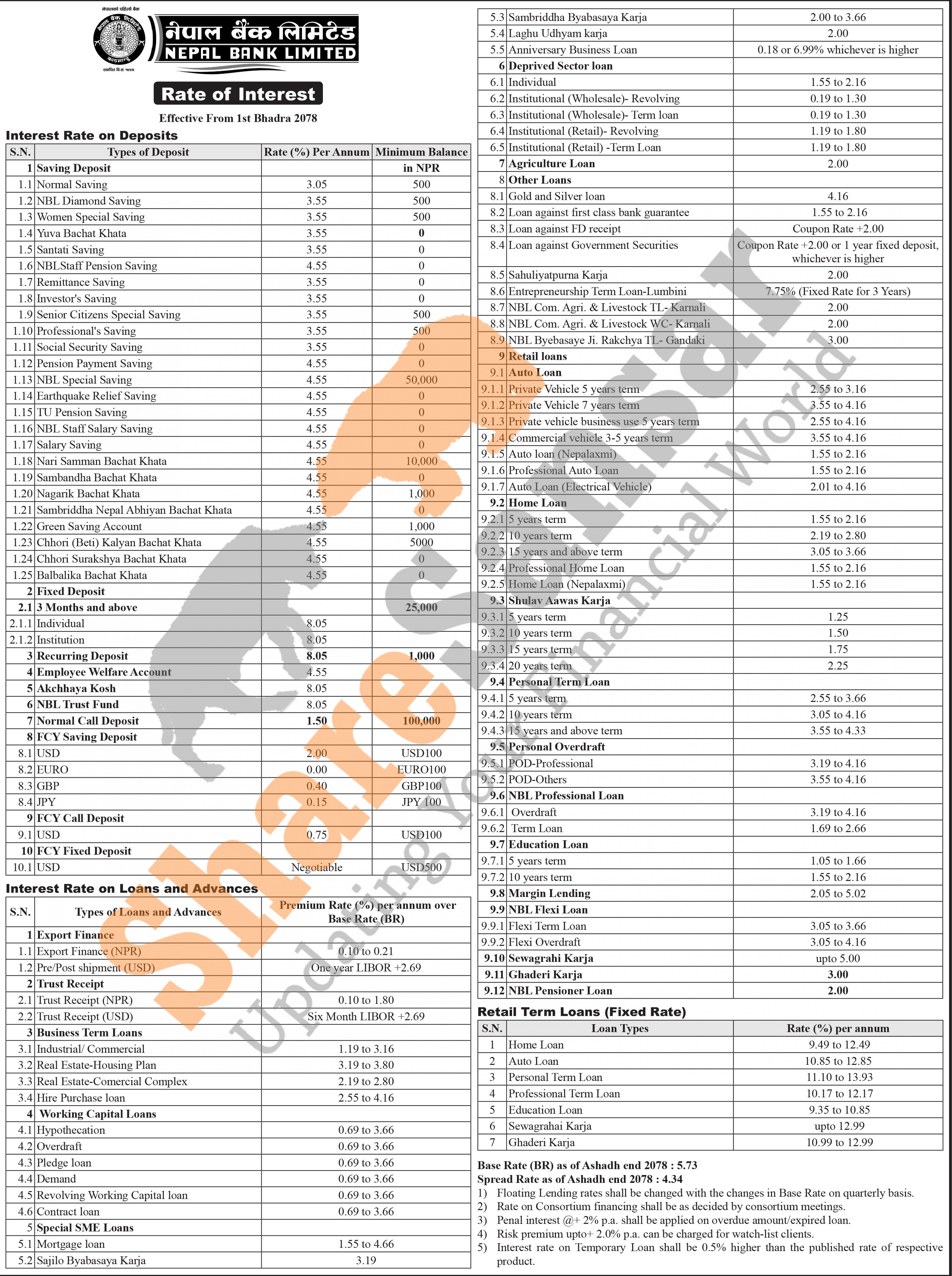 Nepal Bank Limited has published a notice regarding the new interest rate for deposit and loan products and it's effective from 1st Bhadra, 2078.