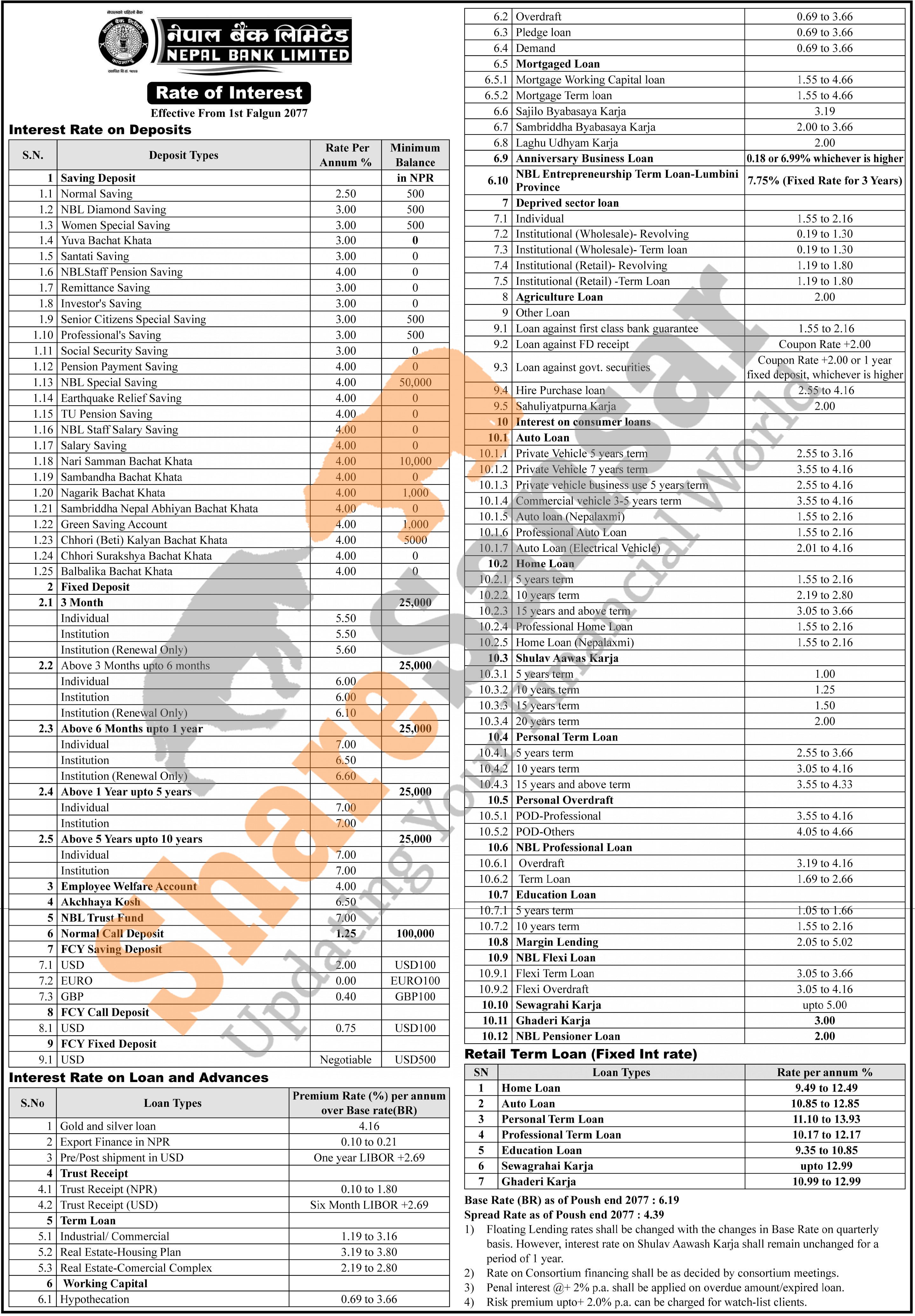 Nepal Bank Limited has published a notice regarding the new interest rate for deposit and loan products and it's effective from 1st Falgun, 2077.