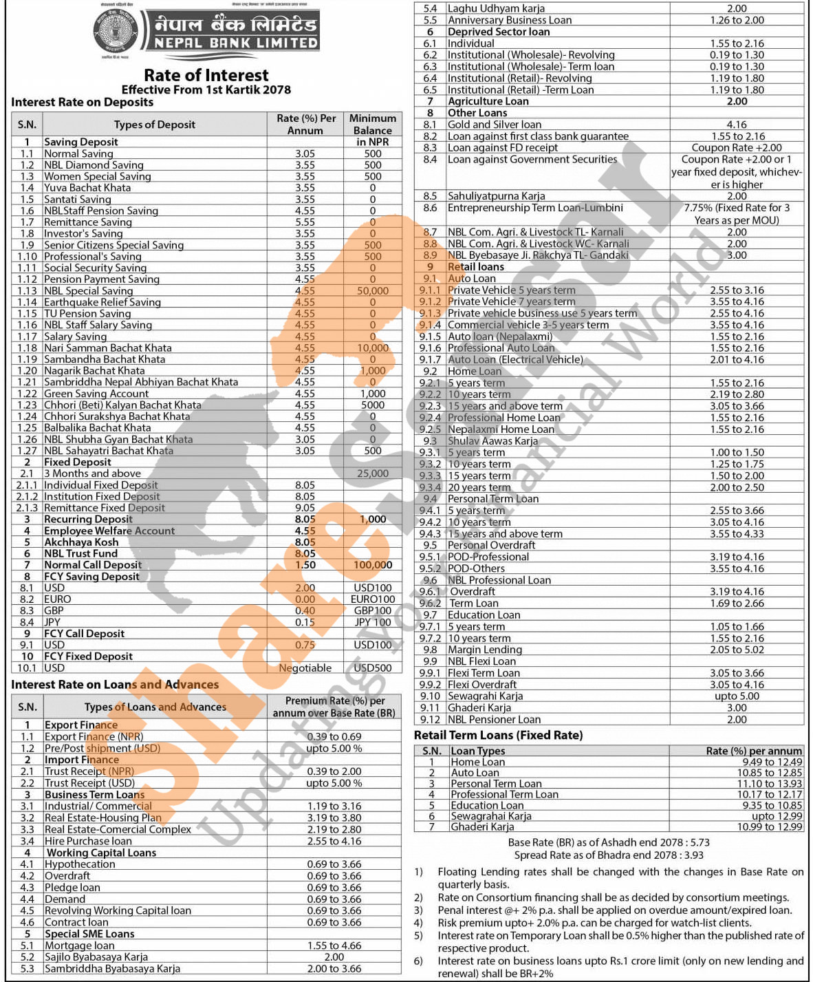 Nepal Bank Limited has published a notice regarding the new interest rate for deposit and loan products and it's effective from 1st Kartik, 2078.