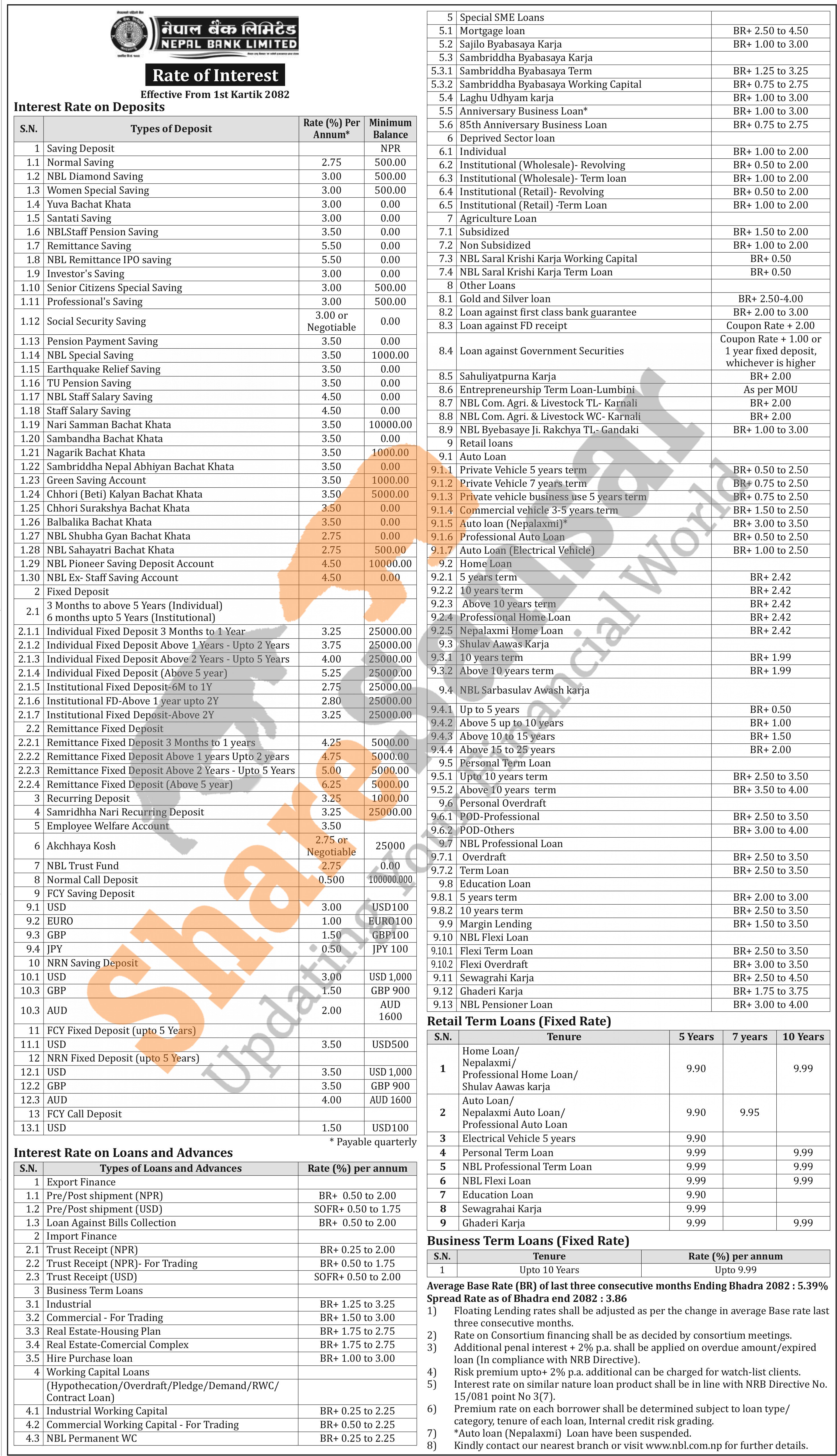 Nepal Bank Limited has published a notice regarding the new interest rate for deposit and loan products and it's effective from 1st Kartik, 2082.