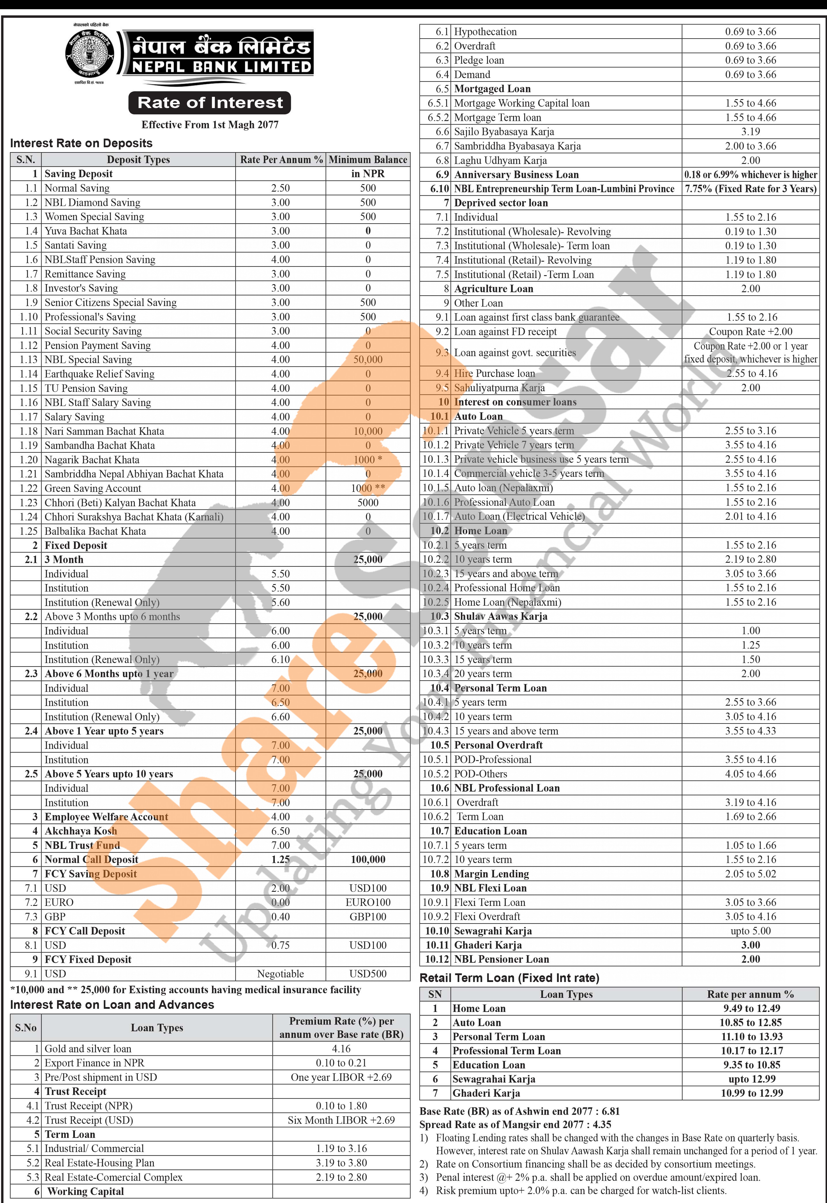 Nepal Bank Limited has published a notice regarding the new interest rate for deposit and loan products and it's effective from 1st Magh, 2077.