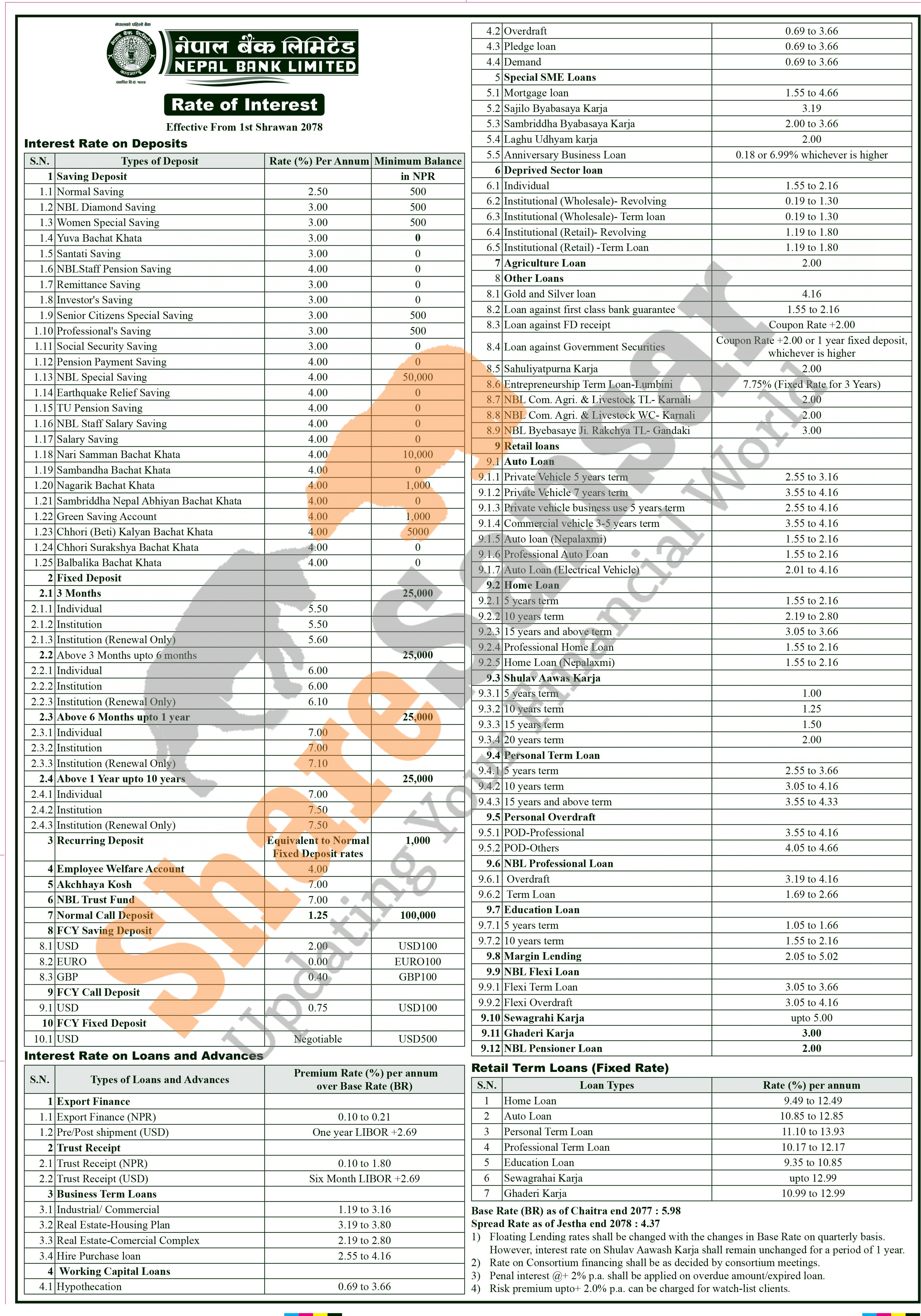 Nepal Bank Limited has published a notice regarding the new interest rate for deposit and loan products and it's effective from 1st Shrawan, 2078.