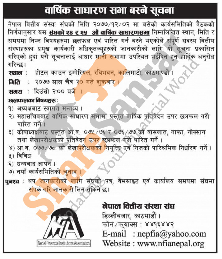 Nepal Bittiya Sanstha Sangh has announced its 24th and 25th Annual General Meeting going to be held on 20th Chaitra, 2077.