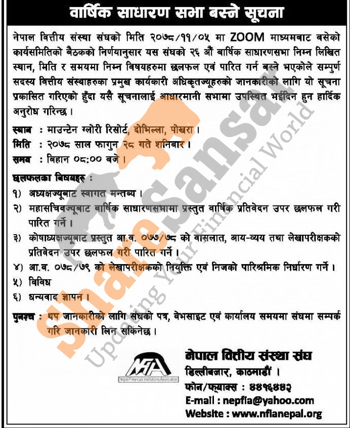 Nepal Bittiya Sanstha Sangh has announced its 26th AGM going to be held on 28th Falgun, 2078.