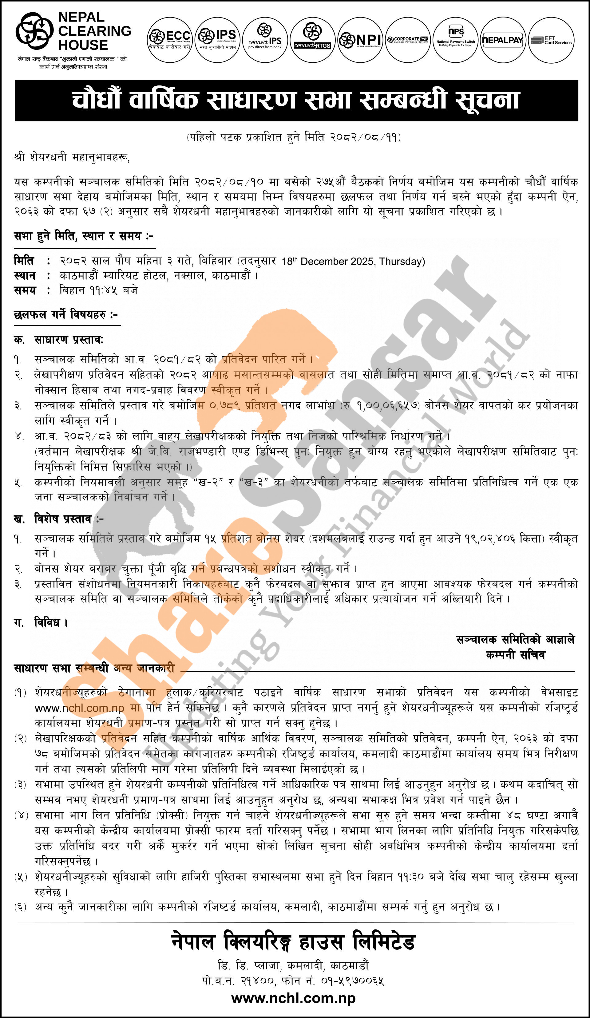 Nepal Clearing House Limited has announced its 14th AGM going to be held on 3rd Poush, 2082.