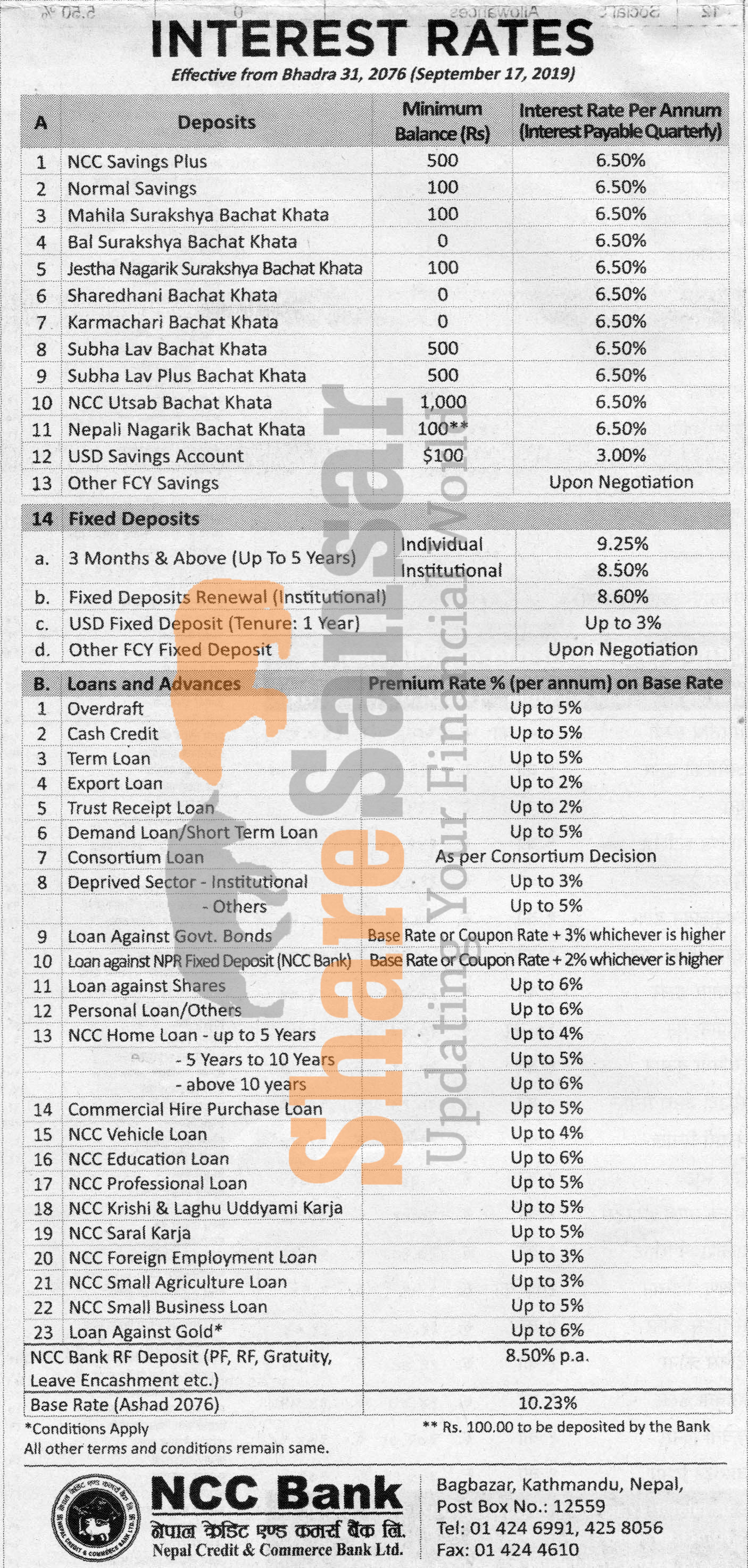 Nepal Credit and Commerce Bank Limited has published a notice regarding new interest rate and its effective from 31st Bhadra, 2076.