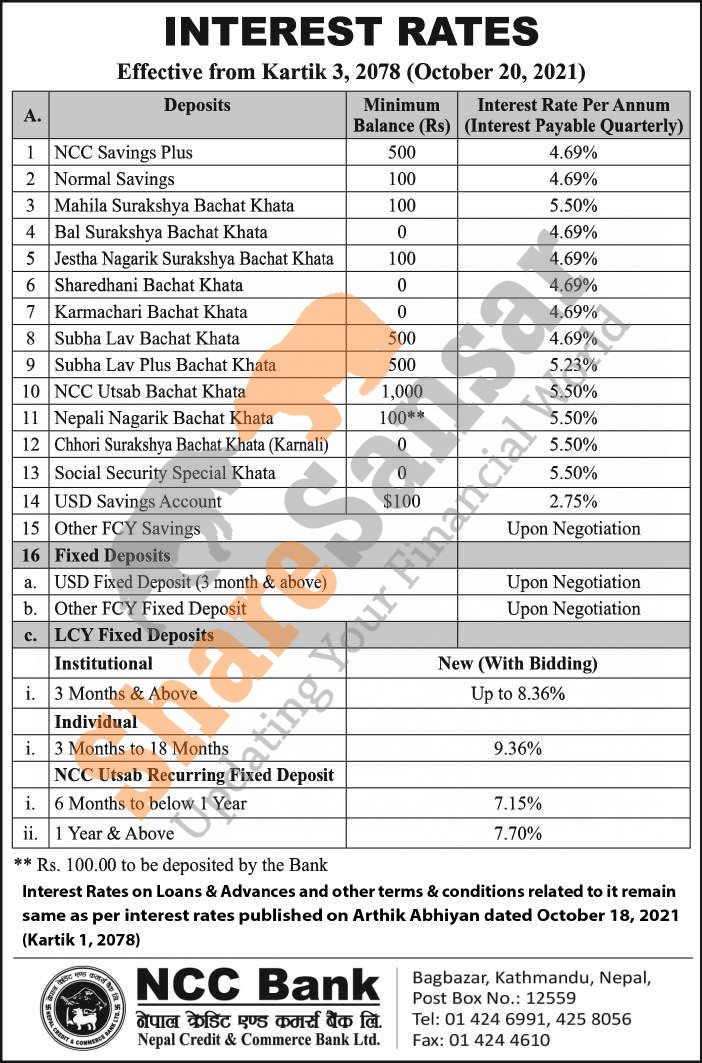 Nepal Credit and Commerce Bank Limited has published a notice regarding new revised interest rate and it's effective from 3rd Kartik, 2078.