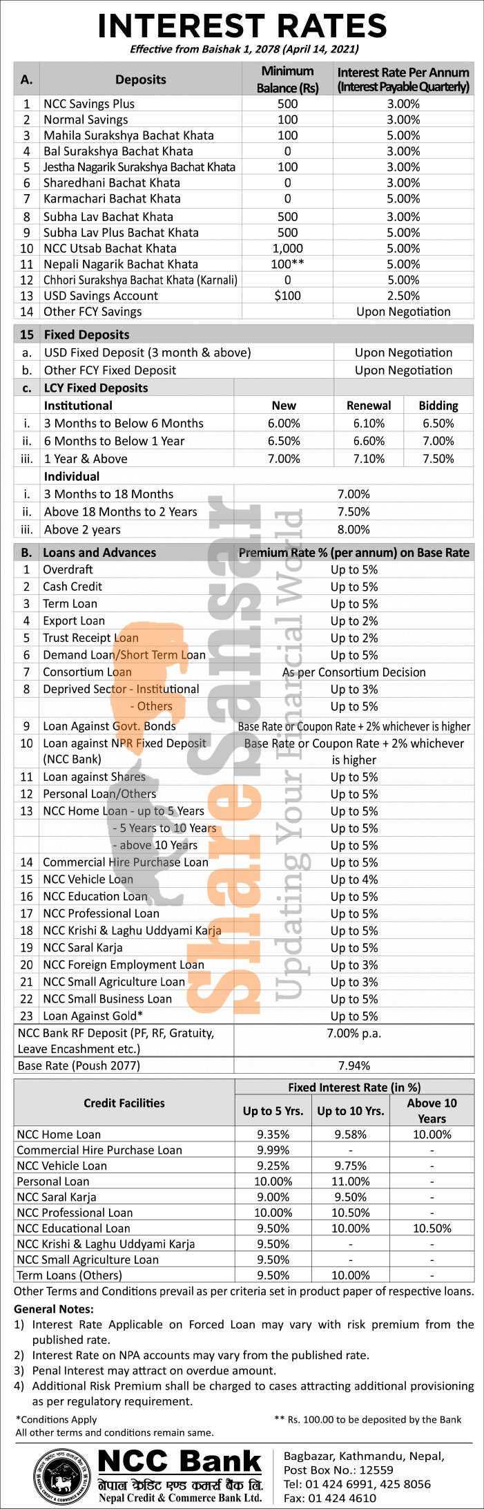 Nepal Credit and Commerce Bank Limited has published a notice regarding the new interest rate for deposit and loan products and it's effective from 1st Baisakh, 2078