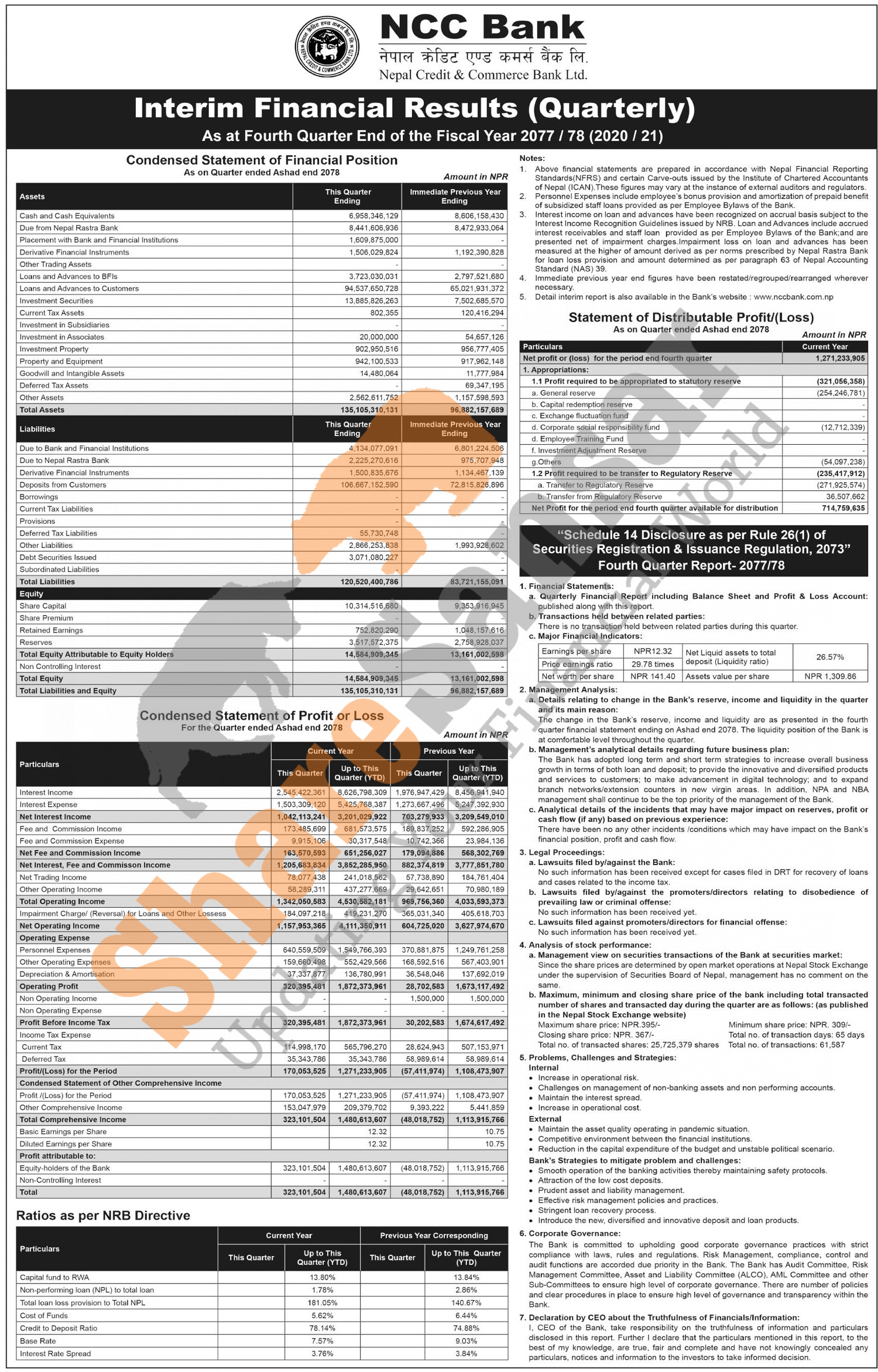 Nepal Credit & Commerce Bank Limited has posted a net profit of Rs 1.27 billion and published its 4th quarter company analysis of the fiscal year 2077/78.