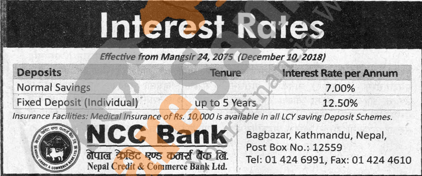 Nepal Credit & Commerce Bank Limited has published a notice regarding new interest rate and its effective from 24th Mangsir, 2075.