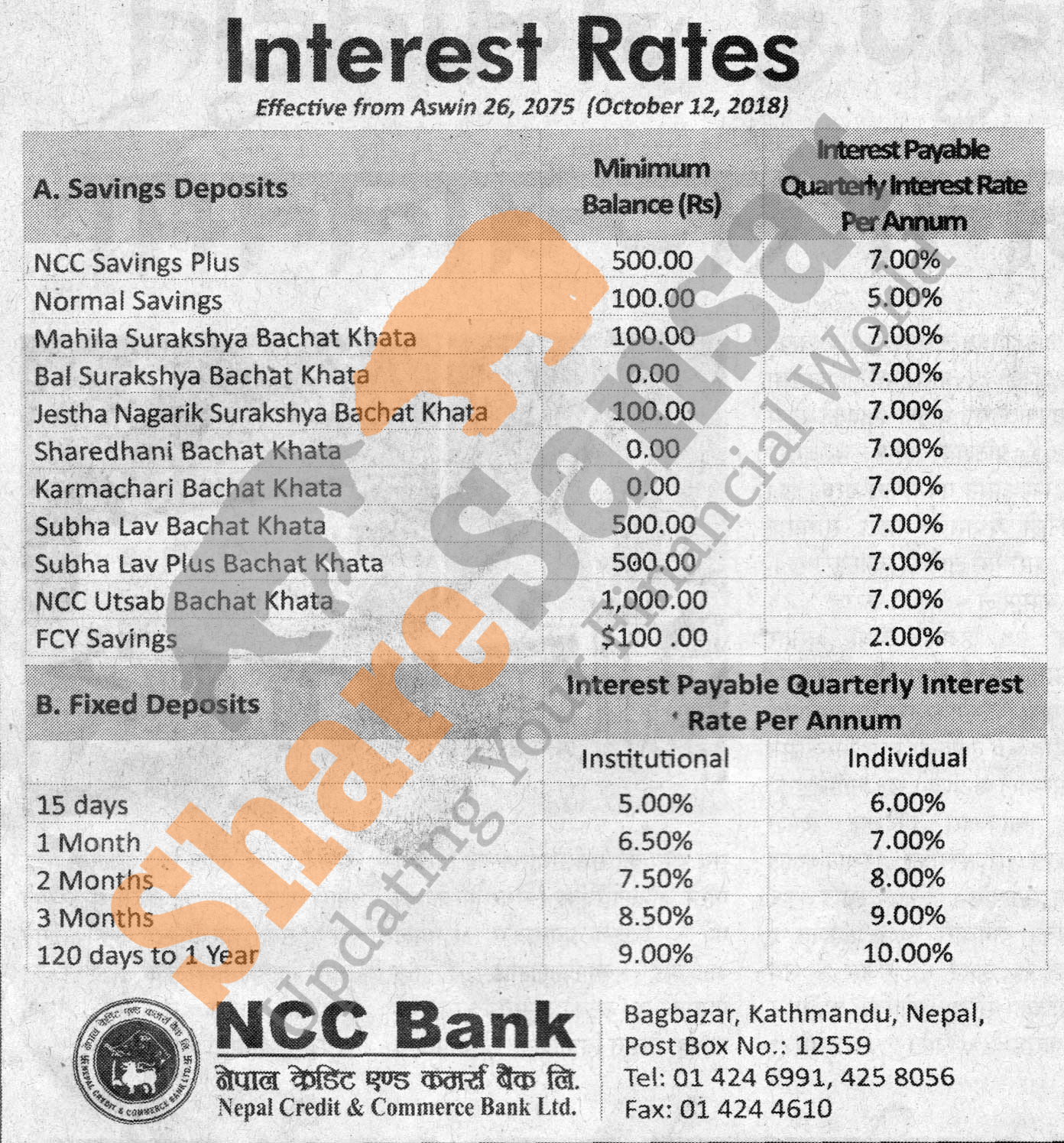 Nepal Credit & Commerce Bank Limited has published a notice regarding new interest rate and its effective from 26th Ashwin, 2075.
